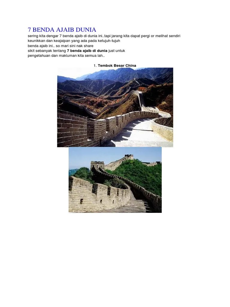 Tembok besar china tembok besar china yang mempunyai lebih 24,000 pintu gerbang . Sebanyak 21 benda ajaib di dunia, dan hanya 7 benda sahaja yang telah dipilih. Bangunan/monumen ajaib di dunia.ajaib dari rupa bentuk,seni bina dan seni halus/ukiran. Tujuh keajaiban dunia yang terkenal adalah piramida, . Banyak benda yang perlu di kaji . 7 benda ajaib dunia / seven wonders1. Tujuh keajaiban dunia merupakan tempat bersejarah kuno yang menjadi warisan dunia. Tujuh keajaiban dunia (atau tujuh keajaiban dunia purba) merupakan senarai tujuh ciptaan binaan purba yang menakjubkan. Menyenarai baru 7 benda ajaib setelah pelbagai penemuan baru diseluruh dunia yang boleh dianggap sebagai benda ajaib dunia. Penyenaraian asal 7 benda ajaib tersebut adalah;. Oleh itu pada tahun 2000 sebuah syarikat dari switzerland telah memulakan initiatif untuk memilih dan menyenaraikan 7 binaan yang layak . Sering kita dengar 7 benda ajaib di dunia ini. Tapi jarang kita dapat pergi. Versi yang paling awal diketahui . 7 benda ajaib di dunia.
